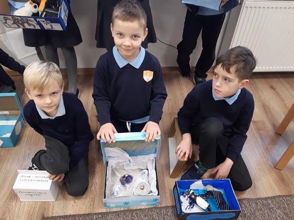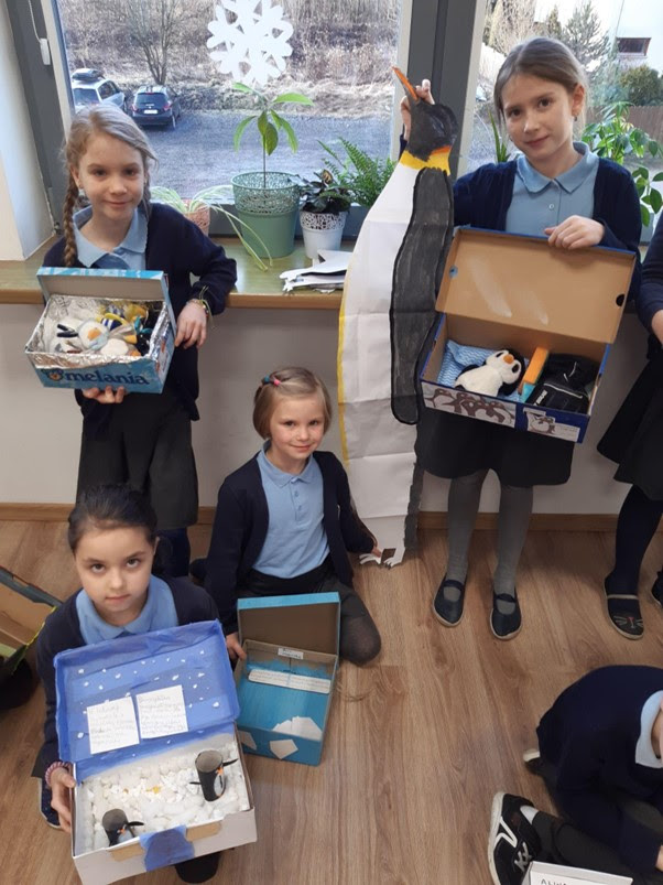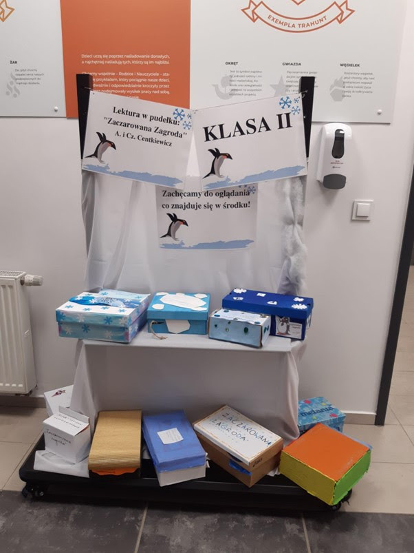 | Drugoklasiści omawiali książkę “Zaczarowana Zagroda”, która zainspirowała ich do wykonania lektury w pudełku. Pojawiło się wiele wersji Elegancików i każdy z nich był wyjątkowy. Nie zabrakło też rzeczywistych rozmiarów pingwina, który był większy od niejednego ucznia! Pudełka inspirowane lekturą można było zobaczyć na wystawie w pierwszym tygodniu po feriach. |